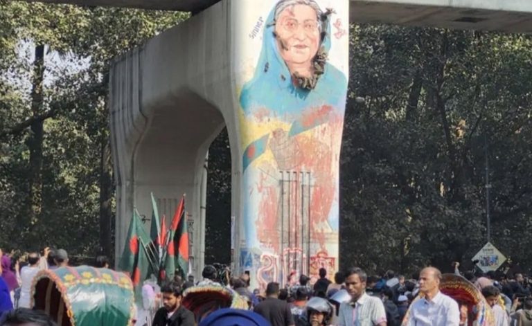 এরা আগে শনিবার রাতে, টিএসসির মেট্রোরেলের পিলারে শেখ হাসিনার চুন-কালি মাখানো ব্যঙ্গ গ্রাফিতির একাংশ মুছে ফেলে সিটি করপোরেশন কর্মীরা।