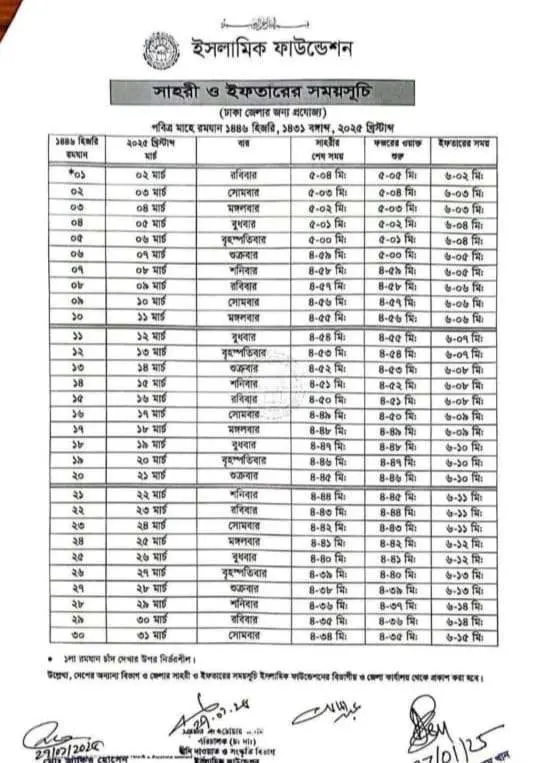 গত ২৭ জানুয়ারি ইসলামিক ফাউন্ডেশন ১৪৪৬ হিজরির রমজান মাসের সেহরি ও ইফতারের এই সময়সূচি চূড়ান্ত করা হয়।